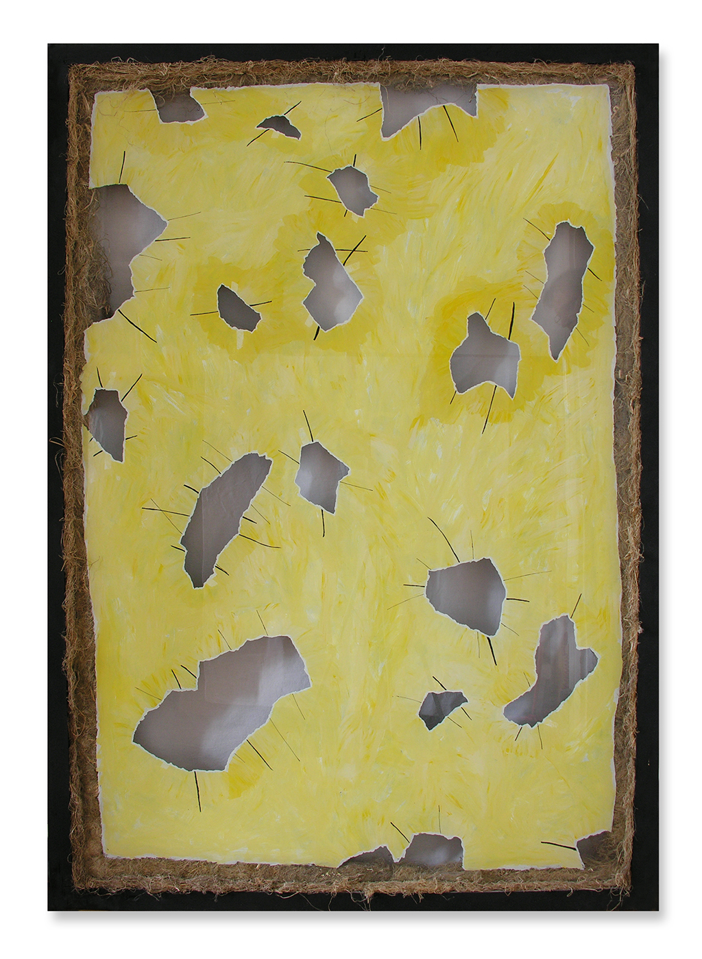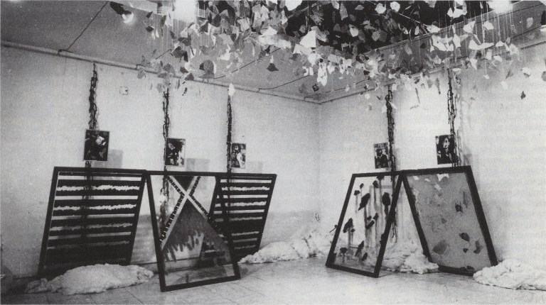 A térberendezés, environment- és az installáció készítés itt kezdett el igazán érdekelni, és magát a kiállítóteret fogtam fel úgy, mint egy komplex műtárgyat, amibe be lehet lépni, “részévé” lehet válni. Az itt kiállított “Változékony idő” c. munkámban a kiállítóteret belülről körbevontam “hófogó”-szerűen egymásnak támasztott aránylag nagyméretű (110 x 152 x 8 mm), festett (ugyanakkor részben transzparens) üvegtáblákkal. A hófogók között (ipari vattából) kb. fél méter magas hókupacokat helyeztem el, míg az egyes táblák fölött személyes jellegű (szintén többrétegű, fényérzékenyített üvegre fotózott) “városlakó” portrékat helyeztem el. Mind a 8 db nagy üvegtábla mögött a mennyezetről egy-egy színezett kötélből készített, cirka 4 m hosszúra felnagyított “kipu” (inka csomóírás) lógott. A teremben ezen kívül felülről vékony damilokon lelógatott rengeteg szöveges újság-fecni darabka csüngött alá (manapság talán úgy mondanánk, hogy “információ-felhő”), távolabbról nézve, már kicsit inkább a hóesés képét imitálva. A teret, melybe be lehetett sétálni, így minden oldalról körülvettem a valós idő, a történeti idő és az időjárási idő szimbolikus tárgyaival.