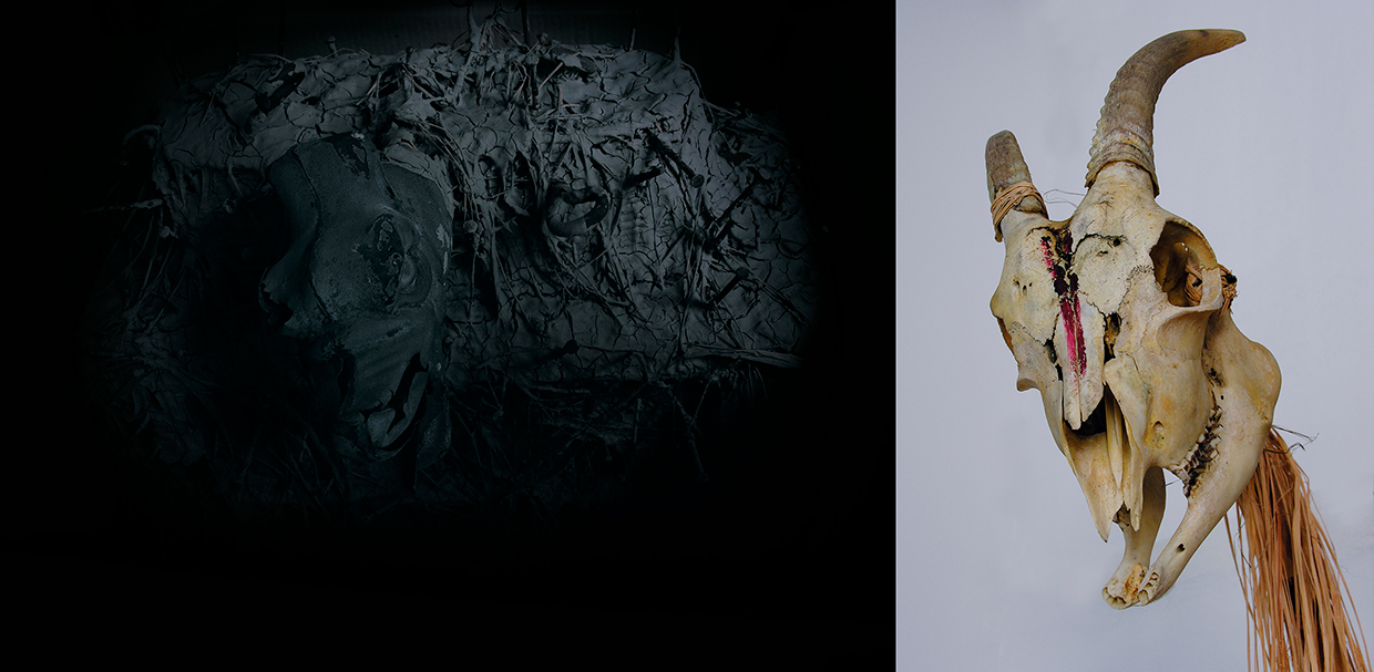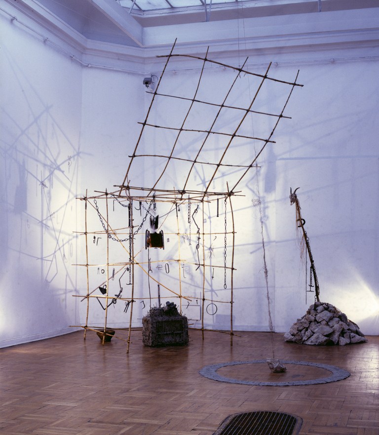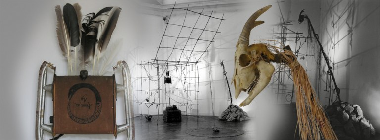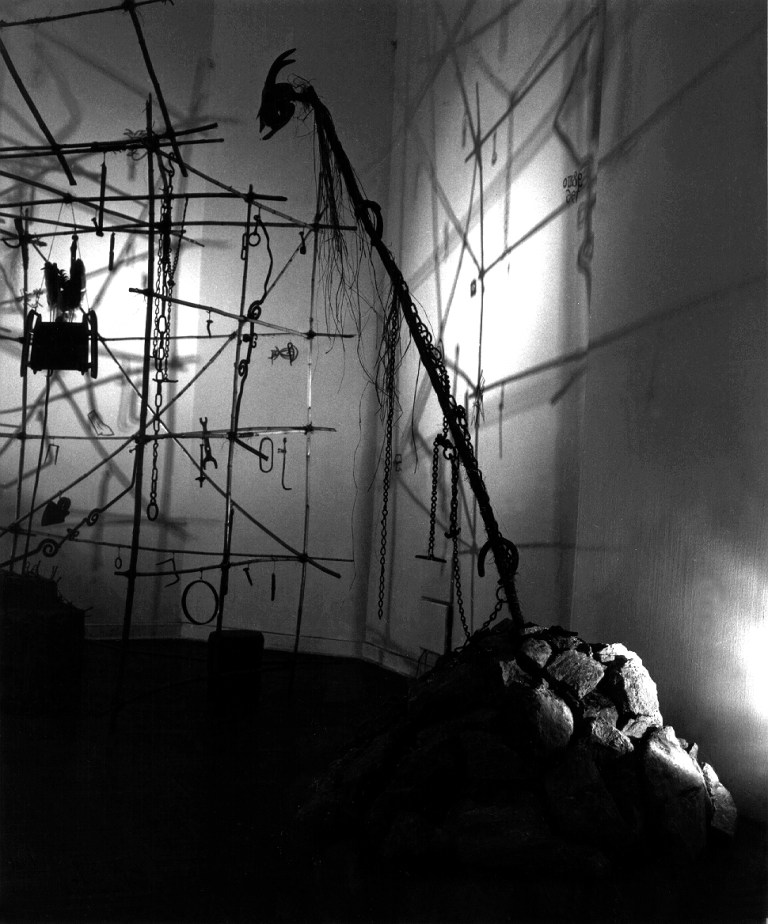 Ebben a munkában is az volt a fontos számomra, mint még jó néhány másik installációmnál, hogy nagyon pontosan, tudatosan megkomponálva, de végül is alkalmilag összerakott igen egyszerű elemekből (agyag, nád, kő, állatkoponya, korrodált vasdarabok, stb…) felépítsek egy olyan különös teret, mely a benne lévő elemek, és régebbi korokból származó, vagy arra utaló tárgyi idézetek “kisugárzása által” keletkezzék egy olyan szakrális jellegű, meditatív tér, mely szándékom szerint talán alkalmas lehet arra, hogy ha kellő ideig benne, vagy előtte állva, a befogadó “kegyelmi állapotba” kerülhet, azaz talán alkalmas e hely a kapcsolatfelvételre akár “magasabb szellemi erőkkel”.